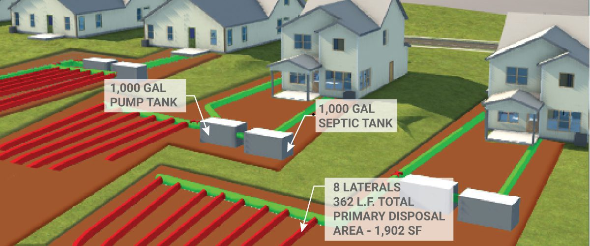 Septic systems function to treat household wastewater by using natural and technological processes. In a septic system, Household waste enters the septic tank, heavy solids settle out to form a layer of sludge at the bottom, while grease and light solids float to the top forming a layer of scum. The partially treated effluent, located in the middle of the septic tank, flows into the pump chamber to be then pumped under low pressure through the drainfield.